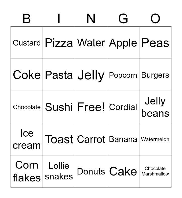 This bingo card has a free space and 27 words: Banana, Orange, Popcorn, Donuts, Coke, Water, Pizza, Ice cream, Cordial, Watermelon, Chocolate, Apple, Corn flakes, Lollie snakes, Burgers, Chips, Pasta, Jelly, Toast, Custard, Jelly beans, Cake, Sushi, Chocolate Marshmallow, Carrot, Peas and Bean.