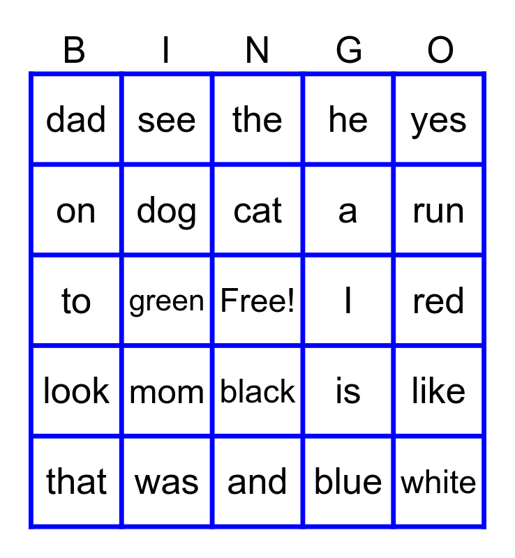 This bingo card has a free space and 27 words: is, this, a, and, on, the, see, look, I, like, to, he, that, was, run, play, dog, cat, mom, dad, red, blue, green, white, black, yes and no.