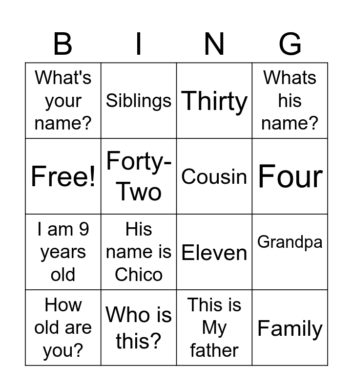 This bingo card has 16 words: Who is this?, Grandpa, Thirty, What's your name?, I am 9 years old, Siblings, Eleven, This is My father, Free!, Forty-Two, How old are you?, Whats his name?, His name is Chico, Four, Cousin and Family.