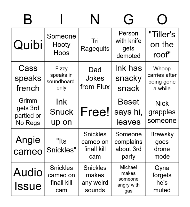 This bingo card has a free space and 30 words: Snickles cameo on finall kill cam, Miku Rages, Ink Snuck up on, Hank Demotes Someone, Quibi, Tri Ragequits, Fizzy speaks in soundboard-only, Snickles cameo on finall kill cam, Beset says hi, leaves, Snickles makes any weird sounds, Nick grapples someone, Gyna forgets he's muted, Michael makes someone angry with gas, Gyna forgets he's muted, Whoop carries after being gone a while, Reuben blames lag, Someone complains about 3rd party, Angie cameo, "Its Snickles", "Tiller's on the roof", Grimm gets 3rd partied or No Regs, David shows up, Someone Hooty Hoos, Ink has snacky snack, Cass speaks french, Person with knife gets demoted, Brewsky goes drone mode, Audio Issue, Dad Jokes from Flux and Fizzy misses a wallbounce in a recap.