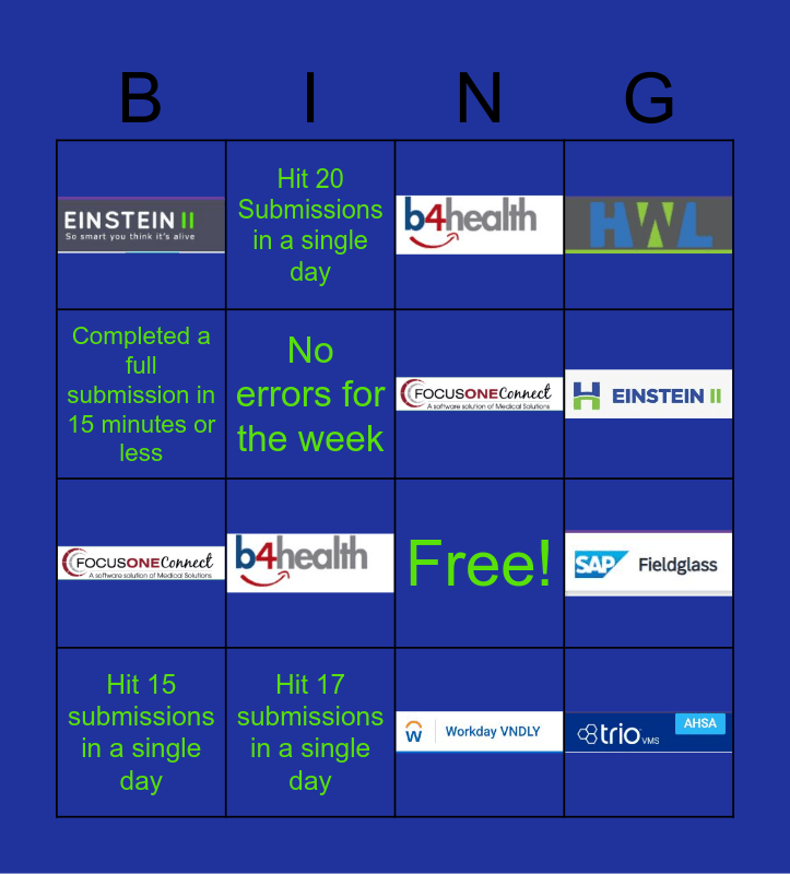 This bingo card has 15 images and 7 words: Hit 17 submissions in a single day, Hit 20 Submissions in a single day, No errors for the week, Free!, Completed a full submission in 20 minutes or less, Hit 15 submissions in a single day and Completed a full submission in 15 minutes or less.