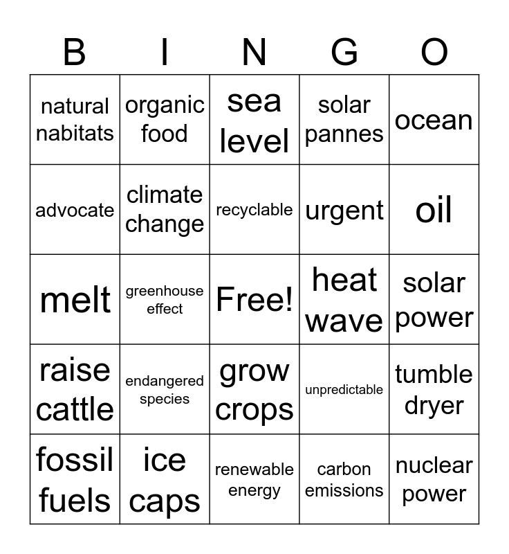 This bingo card has a free space and 29 words: fossil fuels, global warming, greenhouse effect, industrialised counties, natural nabitats, sea level, climate change, endangered species, heat wave, ice caps, solar power, nuclear power, renewable energy, carbon emissions, oil, deforestation, grow crops, raise cattle, ocean, melt, unpredictable, extinct, urgent, advocate, solar pannes, organic food, tumble dryer, recyclable and energy-saving bulbs.