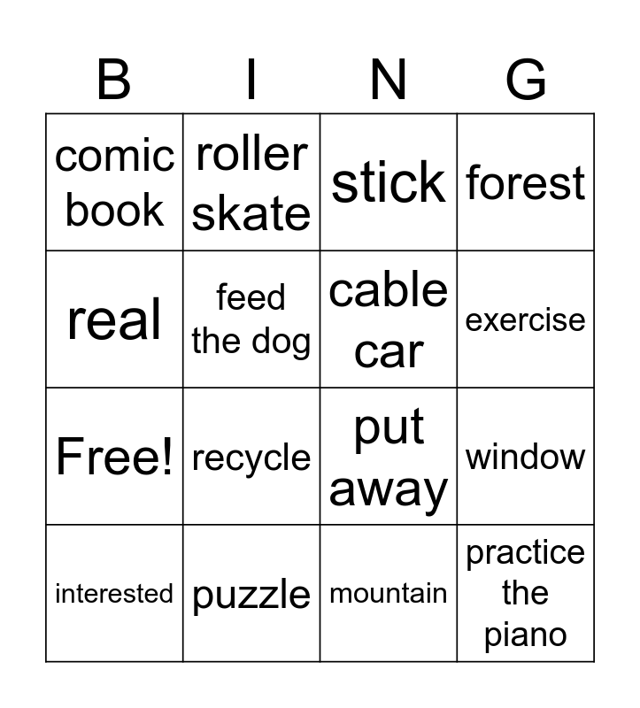 This bingo card has 20 words: window, baking, stick, teenager, interested, real, puzzle, comic book, Free!, roller skate, recycle, put away, feed the dog, practice the piano, cable car, subway, exercise, forest, mountain and india.