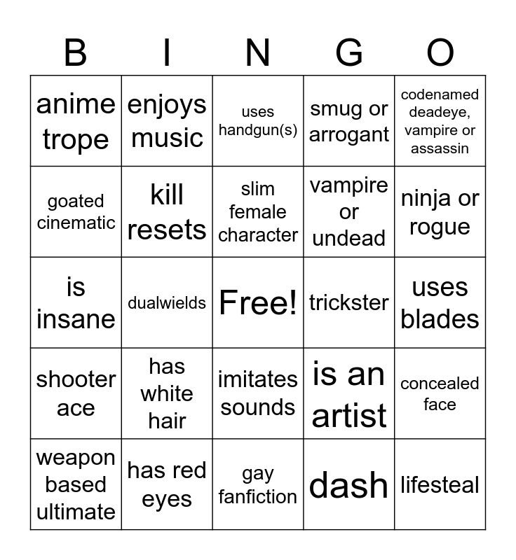 This bingo card has a free space and 24 words: has white hair, has red eyes, slim female character, weapon based ultimate, codenamed deadeye, vampire or assassin, anime trope, goated cinematic, enjoys music, trickster, imitates sounds, vampire or undead, is insane, is an artist, concealed face, kill resets, dash, uses blades, uses handgun(s), ninja or rogue, dualwields, lifesteal, shooter ace, smug or arrogant and gay fanfiction.