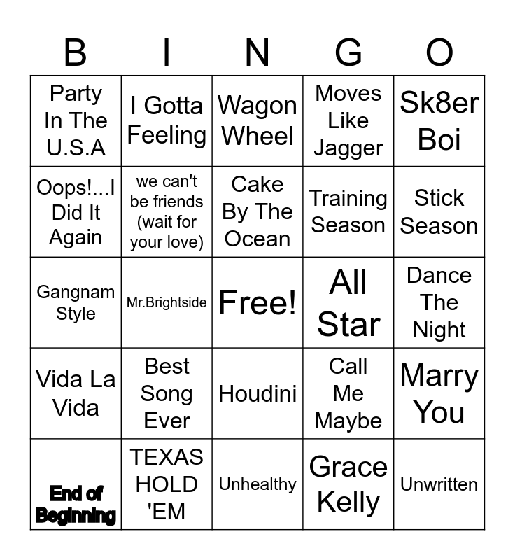 This bingo card has a free space and 29 words: End of Beginning, As It Was, Mr.Brightside, exes, Party In The U.S.A, Wagon Wheel, we can't be friends (wait for your love), Best Song Ever, All Star, TEXAS HOLD 'EM, Dance The Night, Unwritten, Unhealthy, Grace Kelly, Stick Season, Murder On The Dancefloor, Houdini, Vida La Vida, Sk8er Boi, Gangnam Style, Call Me Maybe, I'm Just Ken, Training Season, Oops!...I Did It Again, Moves Like Jagger, I Gotta Feeling, Marry You, Cake By The Ocean and Uptown Funk.
