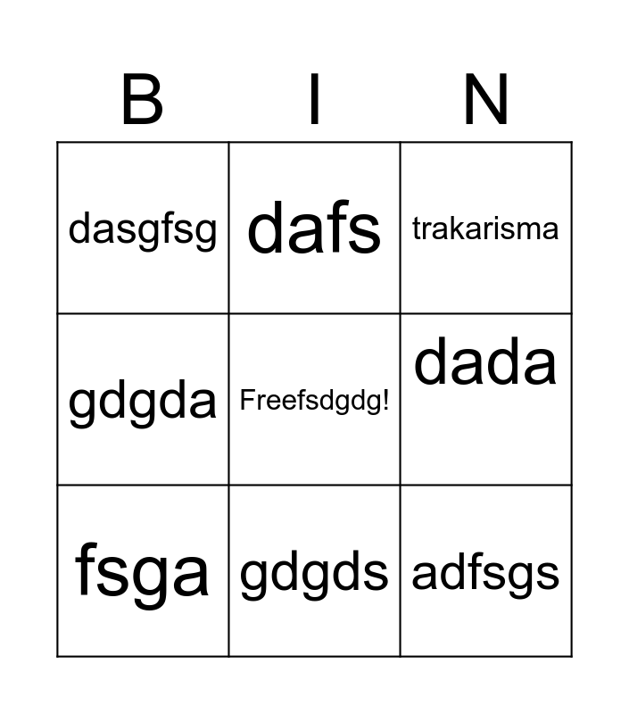 This bingo card has a free space and 8 words: dada, trakarisma, dafs, fsga, dasgfsg, adfsgs, gdgda and gdgds.