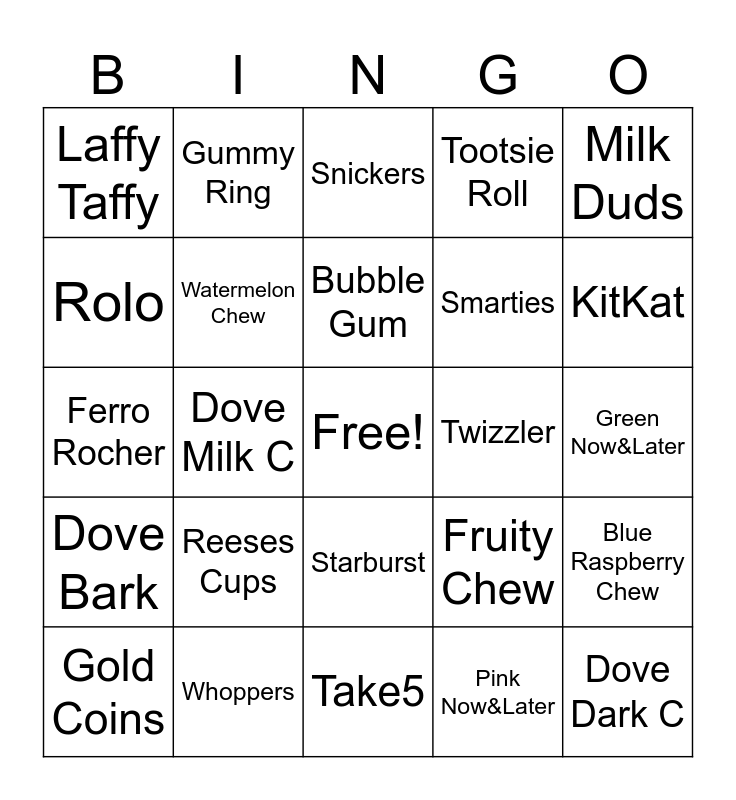 This bingo card has a free space and 24 words: Reeses Cups, Whoppers, Bubble Gum, Gold Coins, Milk Duds, Laffy Taffy, Rolo, Gummy Ring, Twizzler, Starburst, Smarties, Ferro Rocher, Fruity Chew, Blue Raspberry Chew, Watermelon Chew, Pink Now&Later, Green Now&Later, Snickers, KitKat, Dove Milk C, Dove Dark C, Dove Bark, Tootsie Roll and Take5.