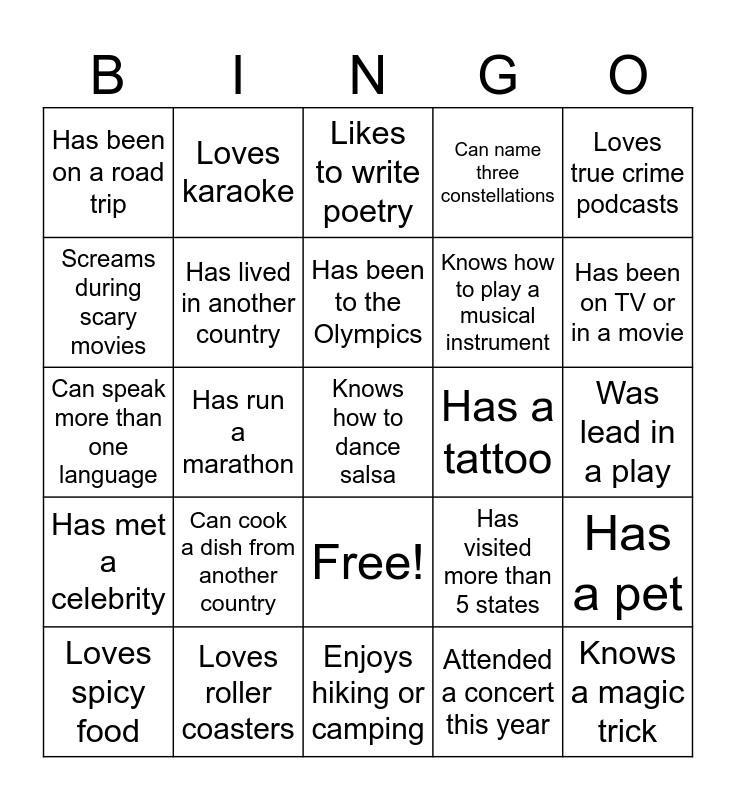 This bingo card has 26 words: Free!, Attended a concert this year, Has been to the Olympics, Loves roller coasters, Loves true crime podcasts, Has been on a road trip, Screams during scary movies, Loves karaoke, Was lead in a play, Has visited more than 5 states, Knows how to play a musical instrument, Can speak more than one language, Has a pet, Loves spicy food, Has run a marathon, Enjoys gardening, Can name three constellations, Has met a celebrity, Likes to write poetry, Knows how to dance salsa, Has been on TV or in a movie, Enjoys hiking or camping, Has a tattoo, Can cook a dish from another country, Has lived in another country and Knows a magic trick.