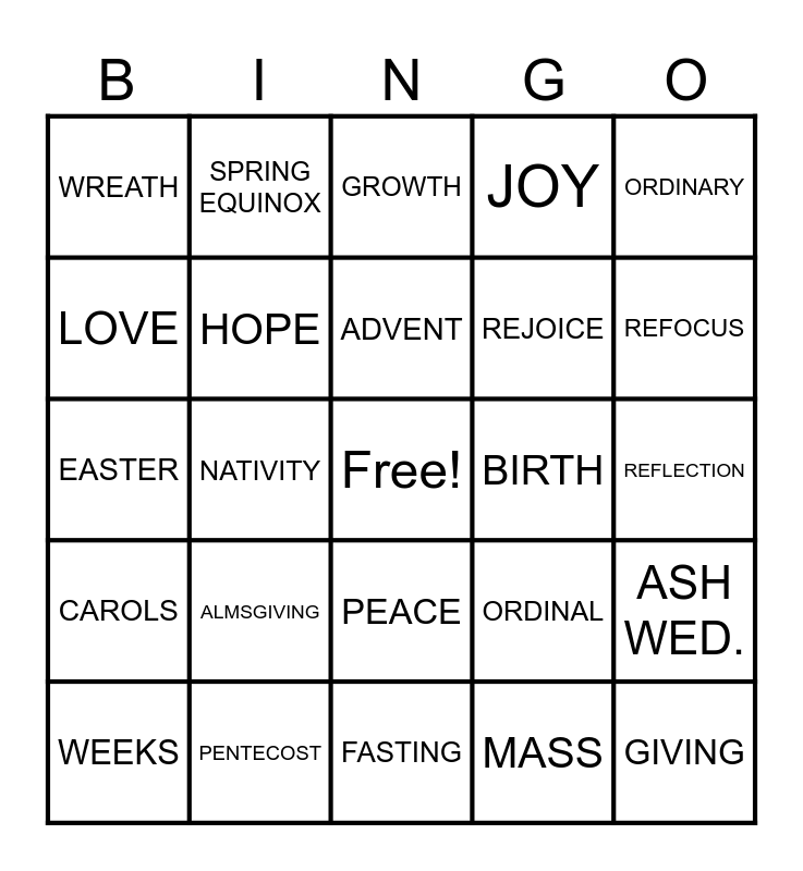 This bingo card has a free space and 35 words: SEASON, CELEBRATION, LITURGY, HOPE, PEACE, JOY, LOVE, CHRISTMAS, ADVENT, LENT, EASTER, ORDINARY, CANDLE, MESSIAH, WREATH, BIRTH, MASS, NATIVITY, CAROLS, GIVING, ORDINAL, WEEKS, ASH WED., PENTECOST, GROWTH, REFOCUS, PRAY, EMBRACE, REJOICE, REFLECTION, PENANCE, FASTING, ALMSGIVING, SPRING EQUINOX and NEW LIFE.