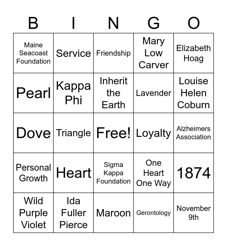 This bingo card has a free space and 27 words: One Heart One Way, Colby College, Lavender, Maroon, Pearl, Friendship, Service, Personal Growth, Loyalty, 1874, Dove, Mary Low Carver, Wild Purple Violet, Ida Fuller Pierce, Louise Helen Coburn, Waterville, Maine, Kappa Phi, Inherit the Earth, Heart, Maine Seacoast Foundation, Alzheimers Association, Gerontology, Triangle, November 9th, Sigma Kappa Foundation, Elizabeth Hoag and Frances Mann Hall.