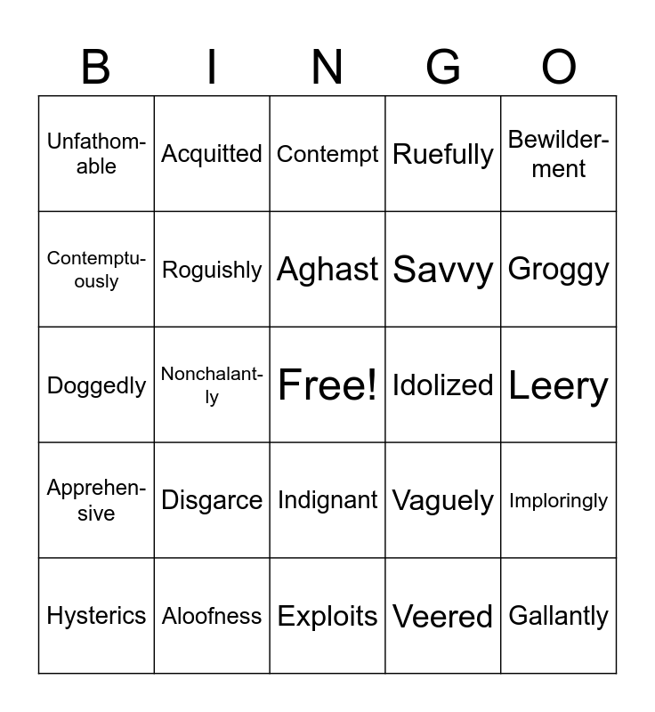 This bingo card has a free space and 25 words: Disgarce, Exploits, Aghast, Hysterics, Bewilder-ment, Unfathom-able, Contemptu-ously, Acquitted, Idolized, Indignant, Savvy, Doggedly, Vaguely, Imploringly, Roguishly, Grimacing, Leery, Contempt, Groggy, Nonchalant-ly, Gallantly, Aloofness, Apprehen-sive, Ruefully and Veered.