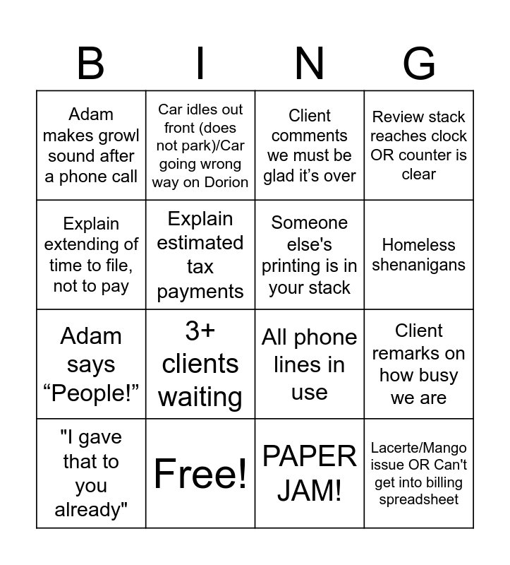 This bingo card has 16 words: Free!, Client remarks on how busy we are, Client comments we must be glad it’s over, Adam makes growl sound after a phone call, Adam says “People!”, Car idles out front (does not park)/Car going wrong way on Dorion, All phone lines in use, PAPER JAM!, Explain extending of time to file, not to pay, Explain estimated tax payments, "I gave that to you already", Review stack reaches clock OR counter is clear, 3+ clients waiting, Homeless shenanigans, Someone else's printing is in your stack and Lacerte/Mango issue OR Can't get into billing spreadsheet.