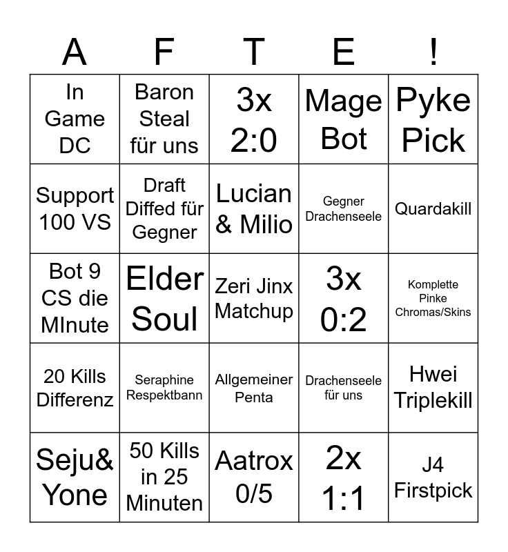 This bingo card has 25 words: Seraphine Respektbann, Aatrox 0/5, Lucian & Milio, Seju& Yone, Pyke Pick, In Game DC, Support 100 VS, Baron Steal für uns, 3x 0:2, Allgemeiner Penta, Gegner Drachenseele, Bot 9 CS die MInute, Drachenseele für uns, Hwei Triplekill, Draft Diffed für Gegner, J4 Firstpick, Komplette Pinke Chromas/Skins, 3x 2:0, Quardakill, Elder Soul, Zeri Jinx Matchup, 50 Kills in 25 Minuten, 20 Kills Differenz, Mage Bot and 2x 1:1.