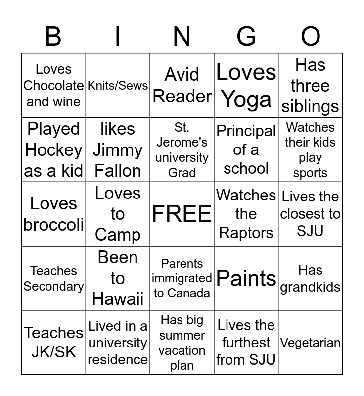 This bingo card has a free space and 24 words: Been to Hawaii, Lived in a university residence, St. Jerome's university Grad, Teaches JK/SK, Has three siblings, Loves Chocolate and wine, Played Hockey as a kid, Knits/Sews, Watches the Raptors, Parents immigrated to Canada, Principal of a school, Loves broccoli, Paints, Has grandkids, likes Jimmy Fallon, Lives the furthest from SJU, Lives the closest to SJU, Avid Reader, Watches their kids play sports, Loves to Camp, Vegetarian, Teaches Secondary, Loves Yoga and Has big summer vacation plan.