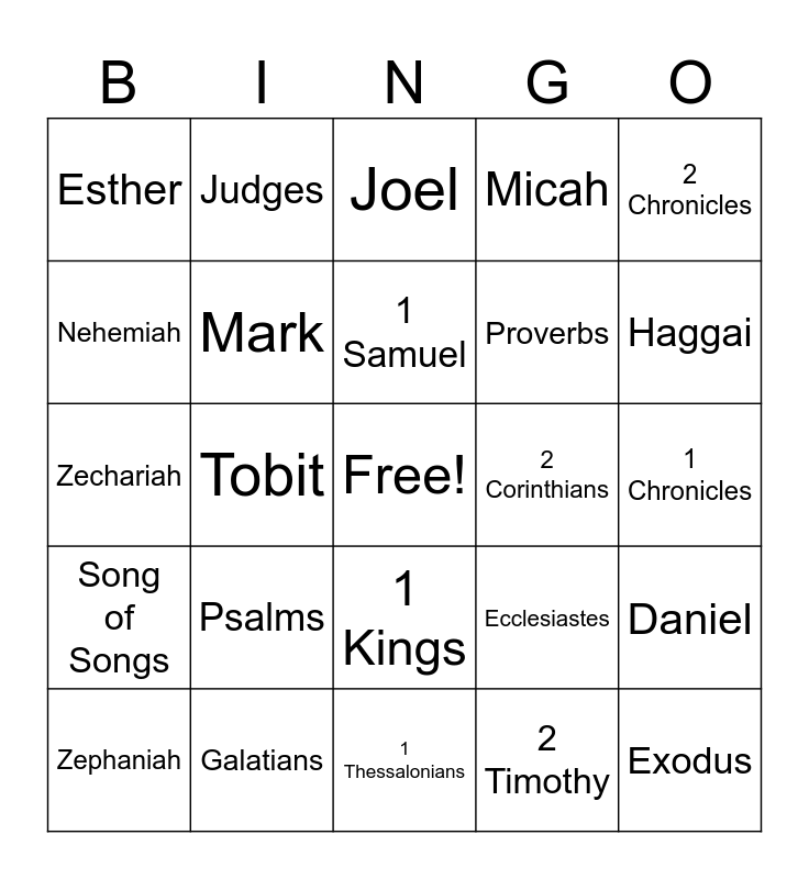 This bingo card has a free space and 68 words: Genesis, Exodus, Leviticus, Numbers, Deuteronomy, Joshua, Judges, Ruth, 1 Samuel, 2 Samuel, 1 Kings, 2 Kings, 1 Chronicles, 2 Chronicles, Ezra, Nehemiah, Tobit, Esther, Job, Psalms, Proverbs, Ecclesiastes, Song of Songs, Isaiah, Jeremiah, Lamentations, Baruch, Ezekiel, Daniel, Hosea, Joel, Amos, Obadiah, Jonah, Micah, Nahum, Habakkuk, Zephaniah, Haggai, Zechariah, Malachi, Matthew, Mark, Luke, John, Acts, Romans, 1 Corinthians, 2 Corinthians, Galatians, Ephesians, Philippians, Colossians, 1 Thessalonians, 2 Thessalonians, 1 Timothy, 2 Timothy, Titus, Philemon, Hebrews, James, 1 Peter, 2 Peter, 1 John, 2 John, 3 John, Jude and Revelation.