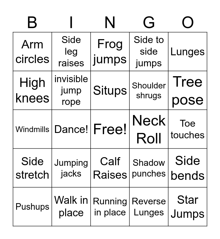 This bingo card has a free space and 25 words: Jumping jacks, Running in place, Situps, Pushups, Lunges, Arm circles, High knees, Side leg raises, Neck Roll, Calf Raises, Shoulder shrugs, Windmills, Shadow punches, Side bends, invisible jump rope, Planks, Toe touches, Frog jumps, Tree pose, Dance!, Star Jumps, Walk in place, Side stretch, Side to side jumps and Reverse Lunges.
