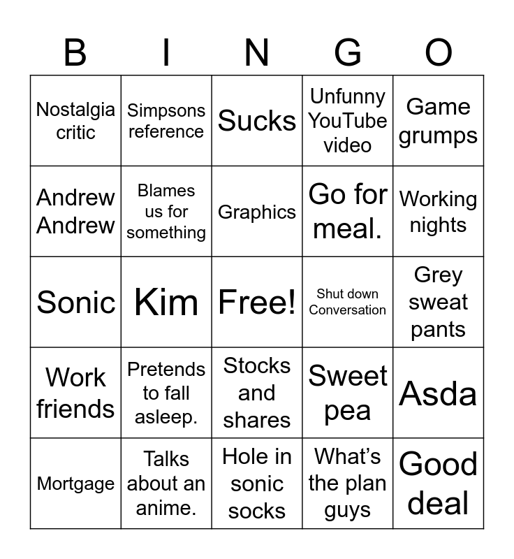 This bingo card has a free space and 24 words: Pretends to fall asleep., Talks about an anime., Graphics, Mortgage, Game grumps, Nostalgia critic, Andrew Andrew, Simpsons reference, Shut down Conversation, Stocks and shares, Go for meal., Sonic, Sweet pea, Asda, Blames us for something, What’s the plan guys, Grey sweat pants, Sucks, Working nights, Kim, Good deal, Work friends, Unfunny YouTube video and Hole in sonic socks.