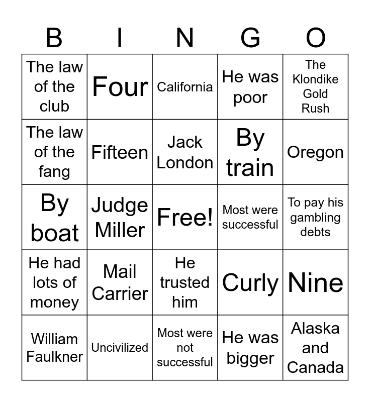 This bingo card has a free space and 24 words: Mail Carrier, Uncivilized, Jack London, William Faulkner, The Klondike Gold Rush, The law of the club, The law of the fang, Four, Most were successful, He trusted him, By train, By boat, Curly, Nine, Fifteen, He was bigger, To pay his gambling debts, California, Oregon, Judge Miller, Alaska and Canada, He had lots of money, He was poor and Most were not successful.