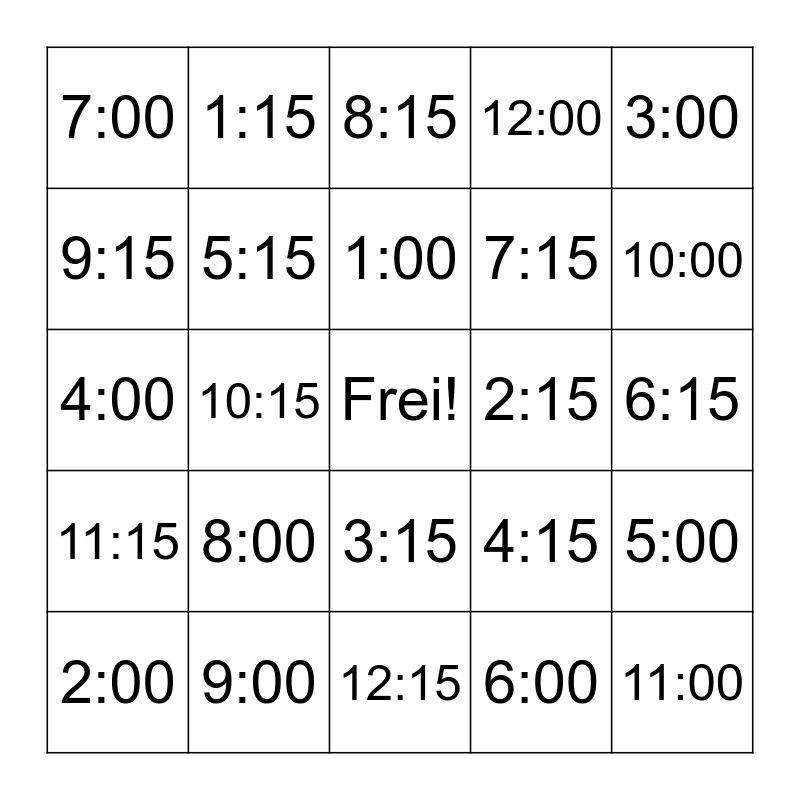This bingo card has a free space and 24 words: 8:00, 9:00, 1:00, 2:00, 3:00, 7:00, 9:15, 1:15, 2:15, 3:15, 7:15, 4:00, 4:15, 5:00, 5:15, 6:00, 6:15, 8:15, 10:00, 10:15, 11:00, 11:15, 12:00 and 12:15.