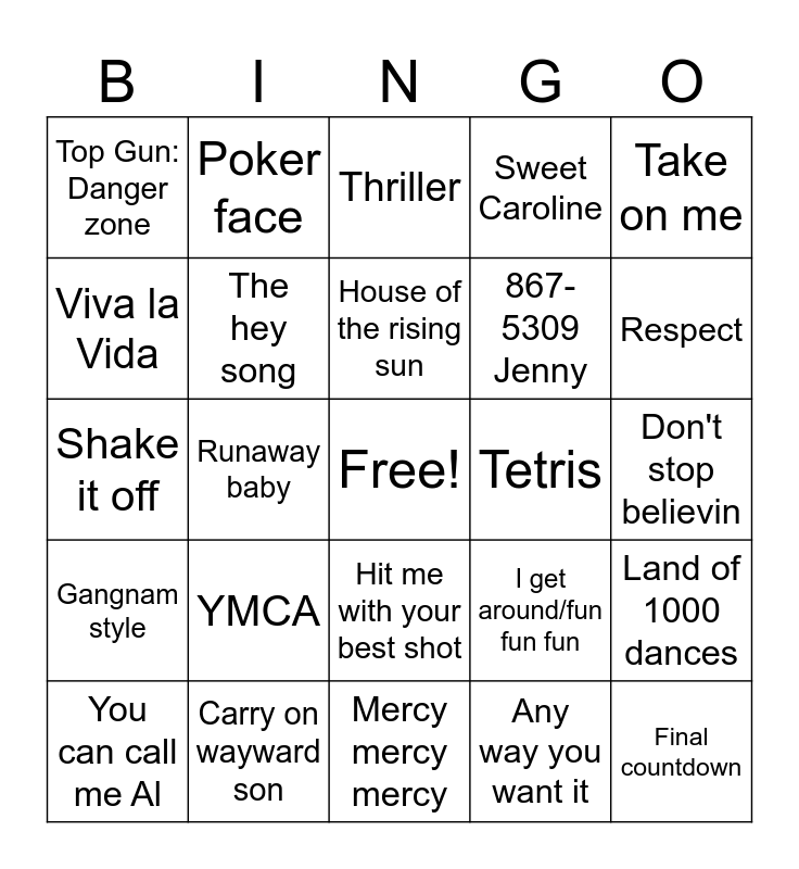 This bingo card has a free space and 37 words: Hey, Baby!, 25 or 6 to 4, We will rock you, The hey song, Land of 1000 dances, YMCA, House of the rising sun, Jump, Take on me, We are young, Runaway baby, Sweet Caroline, Final countdown, Don't stop believin, Viva la Vida, Gangnam style, I will survive/you've lost that lovin feeling, Thriller, Hit me with your best shot, Tetris, Top Gun: Danger zone, Respect, You can call me Al, Mercy mercy mercy, Seven nation army, Any way you want it, Poker face, Get ready for this, Happy, Back in black, Bad romance, Carry on wayward son, Shake it off, Immigrant song, I get around/fun fun fun, 867-5309 Jenny and You really got me.