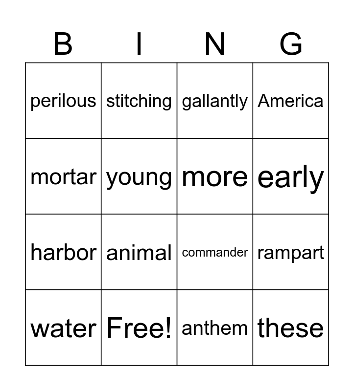 This bingo card has 16 words: Free!, rampart, gallantly, perilous, harbor, stitching, commander, anthem, mortar, young, water, America, animal, early, more and these.