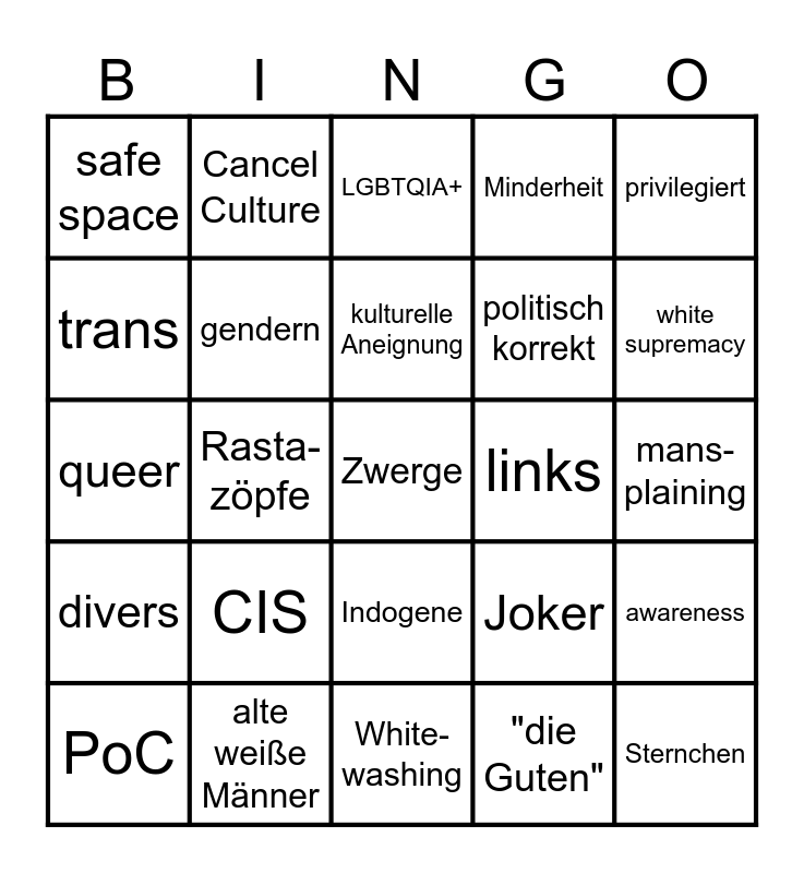 This bingo card has 25 words: CIS, White-washing, kulturelle Aneignung, PoC, privilegiert, safe space, trans, Cancel Culture, links, Indogene, politisch korrekt, queer, Joker, awareness, gendern, Sternchen, mans-plaining, LGBTQIA+, white supremacy, Rasta-zöpfe, Zwerge, alte weiße Männer, divers, Minderheit and "die Guten".