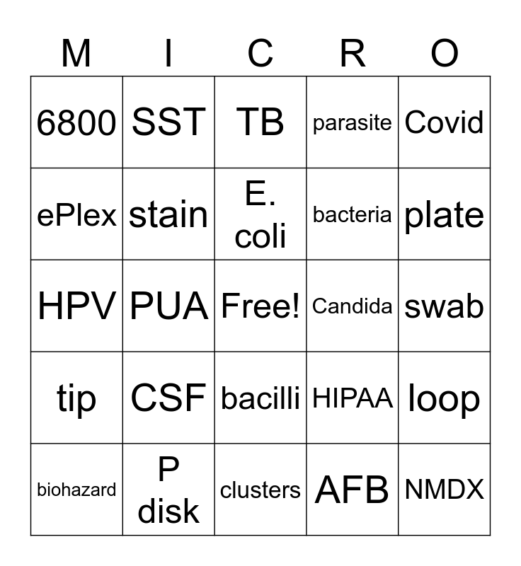This bingo card has a free space and 59 words: BAP, P disk, PCR, tip, AFB, fungus, stain, eye wash, bacteria, virus, parasite, BD Max, ePlex, Xpert, BioFire, 6800, NMDX, Covid, Staph aureus, E. coli, Candida, TB, biohazard, loop, reagent, inventory, infection, colony, plate, urine, BAL, wound, blood culture, centrifuge, SST, plasma, sterile, PUA, requisition, HPV, Diasorin, CSF, swab, E test, needle, pink, hemolysis, cocci, bacilli, clusters, chains, microscope, oil, PYR, catalase, HIPAA, lab week, zone and MAC.
