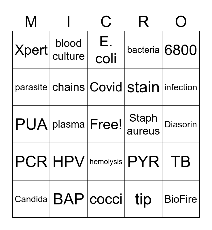 This bingo card has a free space and 59 words: MAC, BAP, lab week, PCR, tip, AFB, chains, zone, stain, eye wash, bacteria, virus, parasite, BD Max, ePlex, Xpert, BioFire, 6800, NMDX, Covid, Staph aureus, E. coli, Candida, TB, biohazard, loop, reagent, inventory, infection, colony, plate, urine, BAL, wound, blood culture, centrifuge, SST, plasma, sterile, PUA, requisition, HPV, Diasorin, CSF, swab, E test, needle, pink, hemolysis, cocci, bacilli, clusters, fungus, microscope, oil, PYR, catalase, HIPAA and P disk.