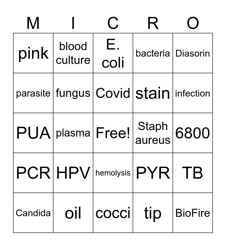 This bingo card has a free space and 59 words: MAC, oil, P disk, PCR, tip, AFB, fungus, zone, stain, eye wash, bacteria, virus, parasite, BD Max, ePlex, pink, BioFire, Diasorin, NMDX, Covid, Staph aureus, E. coli, Candida, TB, biohazard, loop, reagent, inventory, infection, colony, plate, urine, BAL, wound, blood culture, centrifuge, SST, plasma, sterile, PUA, requisition, HPV, 6800, CSF, swab, E test, needle, Xpert, hemolysis, cocci, bacilli, clusters, chains, microscope, BAP, PYR, catalase, HIPAA and lab week.