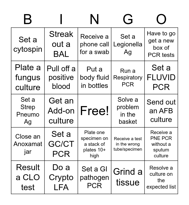 This bingo card has a free space and 28 words: Receive a PNE PCR without a sputum culture, Have a urine cup leak, Run a Respiratory PCR, Grind a tissue, Plate a fungus culture, Receive a phone call for a swab, Streak out a BAL, Close an Anoxamat jar, Solve a problem in the basket, Result a CLO test, Set a Strep Pneumo Ag, Set a Legionella Ag, Do a Crypto LFA, Set a GI pathogen PCR, Set a FLUVID PCR, Set a BV PCR, Set a GC/CT PCR, Pull off a positive blood, Put a body fluid in bottles, Plate one specimen on a stack of plates 10+ high, Set a cytospin, Successfully make a smiley face with the bottles in the BacT, Resolve a culture on the expected list, Get an Add-on culture, Send out an AFB culture, Receive a test in the wrong tube/specimen, Have to go get a new box of PCR tests and Receive a placenta.