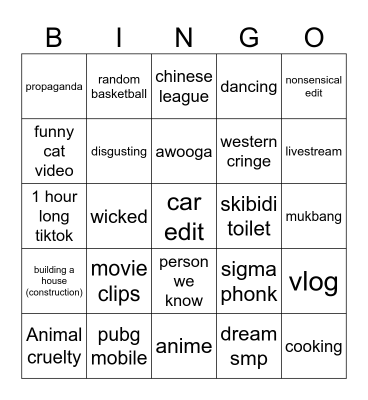 This bingo card has a free space and 24 words: Animal cruelty, movie clips, awooga, dream smp, nonsensical edit, propaganda, random basketball, chinese league, skibidi toilet, mukbang, 1 hour long tiktok, disgusting, sigma phonk, vlog, funny cat video, pubg mobile, anime, dancing, livestream, building a house (construction), wicked, person we know, western cringe and cooking.