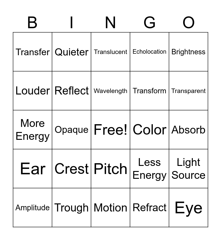 This bingo card has a free space and 24 words: Crest, Trough, Wavelength, Amplitude, Brightness, Transfer, Louder, Quieter, Color, Pitch, Transform, More Energy, Less Energy, Light Source, Reflect, Refract, Absorb, Translucent, Transparent, Opaque, Eye, Ear, Echolocation and Motion.
