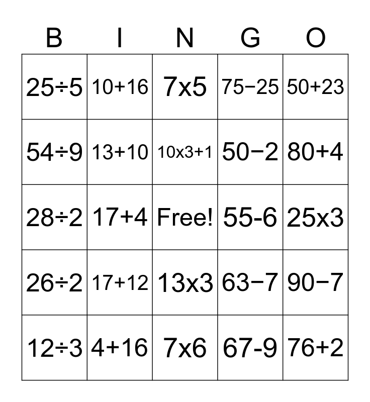 This bingo card has a free space and 74 words: 4÷4, 15+1, 10x3+1, 49−3, 80−9, 16÷8, 7+10, 16x2, 70−23, 9x8, 12÷3, 9+9, 50−2, 50+23, 48÷12, 4+16, 17x2, 55-6, 70+4, 25÷5, 17+4, 7x5, 75−25, 25x3, 54÷9, 8+14, 9x4, 61−10, 86−10, 49÷7, 13+10, 4x10−3, 102−50, 7x11, 56÷7, 12+12, 4x9+2, 57−4, 76+2, 72÷8, 17+8, 13x3, 55−1, 80-1, 50÷5, 10+16, 20x2, 55−0, 40x2, 33÷3, 24+3, 4x11−3, 63−7, 9x9, 36÷3, 13+15, 7x6, 64−7, 80+2, 26÷2, 17+12, 2x20+3, 67-9, 90−7, 28÷2, 10+9, 22x2, 79−20, 80+4, 30÷2, 13+17, 9x5, 90−20 and 97−12.