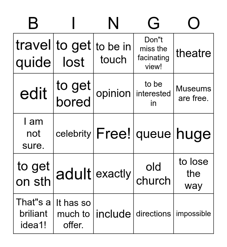 This bingo card has a free space and 27 words: old church, opening time, to be interested in, include, edit, to be in touch, to get lost, to get on sth, queue, to lose the way, I am not sure., Don"t miss the facinating view!, That"s a briliant idea1!, It has so much to offer., Museums are free., I am really sorry., to get bored, opinion, adult, travel quide, huge, directions, celebrity, impossible, exactly, theatre and =.