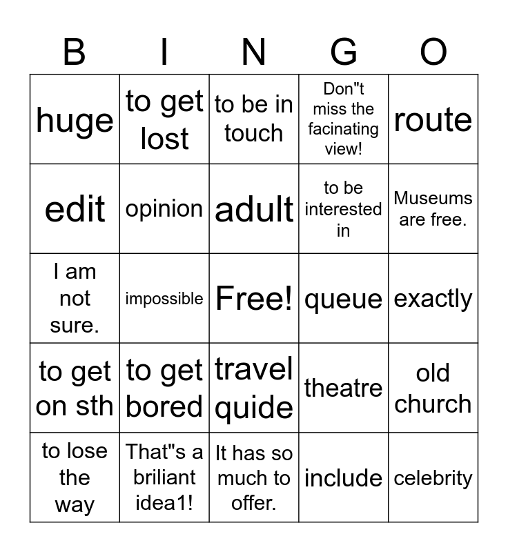 This bingo card has a free space and 28 words: old church, opening time, to be interested in, include, edit, to be in touch, to get lost, to get on sth, queue, to lose the way, I am not sure., Don"t miss the facinating view!, That"s a briliant idea1!, It has so much to offer., Museums are free., I am really sorry., to get bored, opinion, adult, travel quide, huge, directions, celebrity, impossible, exactly, theatre, route and =.