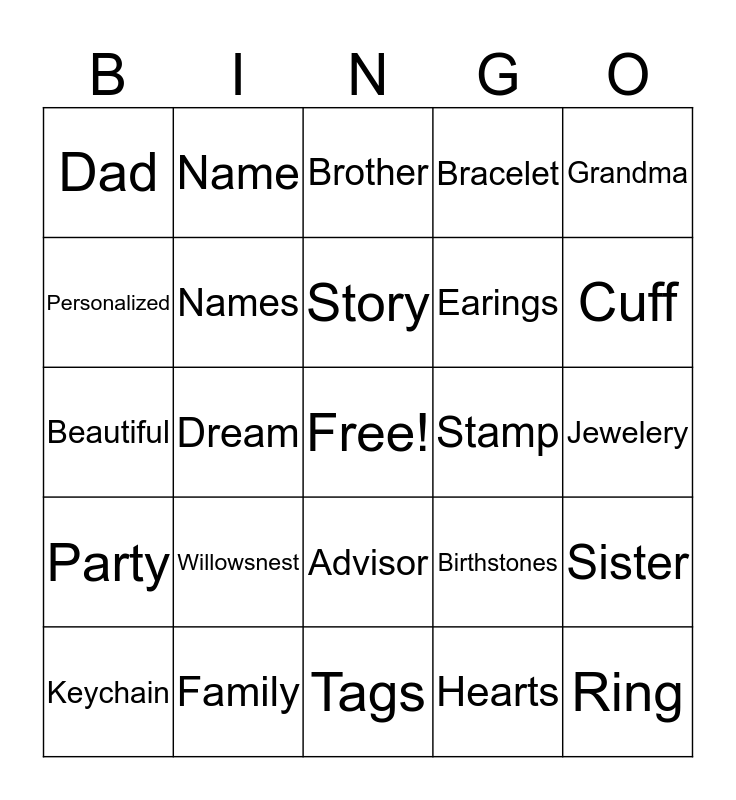 This bingo card has a free space and 24 words: Willowsnest, Family, Story, Keychain, Grandma, Dad, Personalized, Name, Stamp, Advisor, Earings, Beautiful, Birthstones, Sister, Names, Hearts, Jewelery, Brother, Cuff, Dream, Ring, Party, Bracelet and Tags.
