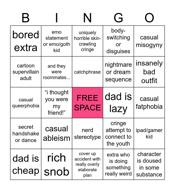This bingo card has a free space and 78 words: someone obsessed with their looks, aged like cheese, uniquely horrible skin-crawling cringe, bad dancing, bad lip-syncing or vocal effects that make no sense given the context, bad green screen or key framing, bad prop or set piece, really strange old person, battle of the bands mention or something of that nature, best friend is in love with main character’s sibling, biker guy, blonde is stupid, body-switching or disguises, bored extra, boring main love interest, cartoon supervillain adult, cartoon supervillain child, casual ableism, casual classism, casual fatphobia, casual racism or obvious cultural appropriation, casual misogyny, casual queerphobia, catchphrase, and they were roommates..., character development? just kidding, character wears useless or tacky belt, character who is literally unhinged, character who really only shows up to provide the same recurring joke, child who is a wonderful little menace, insanely bad outfit, audience clapping for actor literally not doing anything, cover up accident with really overly elaborate plan, critical hit!, dad is cheap, dad is lazy, actor who is even more famous now, extreme property damage, direct ripoff of a real product, character is doused in some substance, elaborate revenge, extreme coincidence, flashback or flashfoward, flirting failure, gang has regular hangout at some public place that isnt school, emo statement or emo/goth kid, ripoff of real person/famous guest star/name dropping, hey! that’s a crime, actually!, hey! that’s not how science works!, boomer humor (i hate my wife), ipad/gamer kid, “i thought you were my friend!”, cringe attempt to connect to the youth, joke goes on WAY too long, jumpscare, live wild animals (not common pets), man in dress is funny because man in dress, mom loves attention or spotlight, miscommunication, nerd stereotype, nightmare or dream sequence, oddly specific store/kiosk, "oh no we lost the one thing we were told not to lose!", one of the main character sings and/or is in a band, prop gag, really awful song, recurring newscaster or host, mean girl clique, secret handshake or dance, rich snob, someone is uncomfortably infatuated with another or stalker, stand-out bad actor, really ugly transition, tries to get into private event, extra who is doing something really weird, viral video, we actually laughed and where i’m from/in my day we *insert strange or concerning thing*.