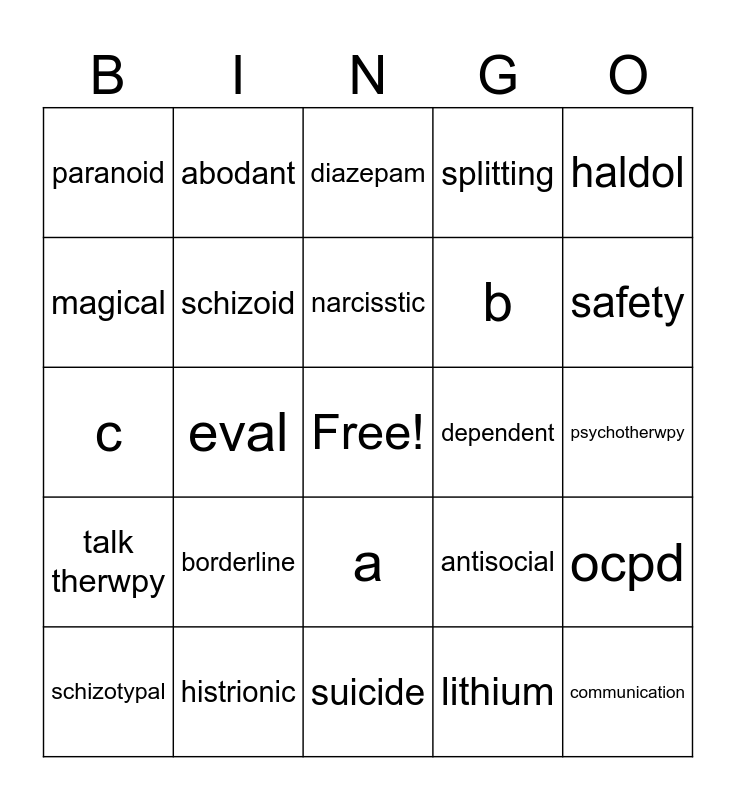 This bingo card has a free space and 24 words: borderline, histrionic, narcisstic, schizotypal, haldol, paranoid, magical, abodant, dependent, a, b, c, antisocial, ocpd, schizoid, lithium, psychotherwpy, diazepam, safety, eval, communication, talk therwpy, splitting and suicide.