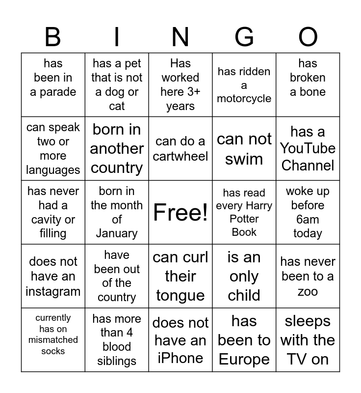 This bingo card has a free space and 24 words: have been out of the country, has more than 4 blood siblings, can do a cartwheel, currently has on mismatched socks, has broken a bone, has been in a parade, can speak two or more languages, has a pet that is not a dog or cat, has read every Harry Potter Book, can curl their tongue, can not swim, has never had a cavity or filling, is an only child, has never been to a zoo, born in another country, has been to Europe, woke up before 6am today, Has worked here 3+ years, has a YouTube Channel, born in the month of January, sleeps with the TV on, does not have an instagram, has ridden a motorcycle and does not have an iPhone.