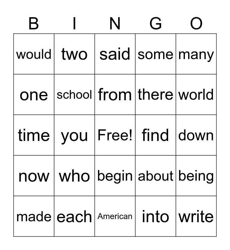 This bingo card has a free space and 24 words: who, each, from, made, many, would, one, two, find, begin, there, time, about, being, school, into, down, said, world, you, write, now, some and American.