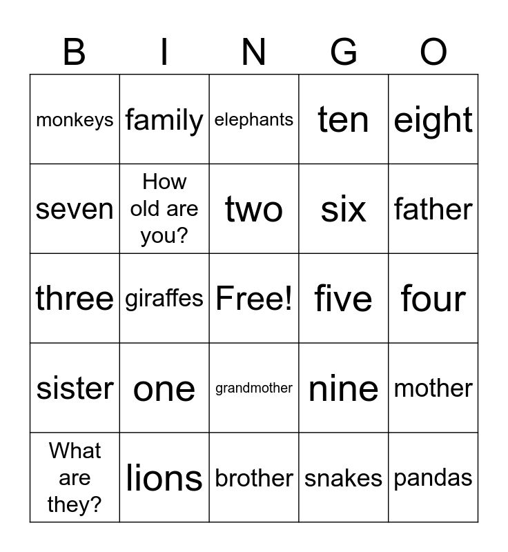 This bingo card has a free space and 24 words: one, lions, two, What are they?, eight, monkeys, seven, family, five, grandmother, six, three, nine, mother, How old are you?, snakes, four, elephants, father, giraffes, pandas, sister, ten and brother.