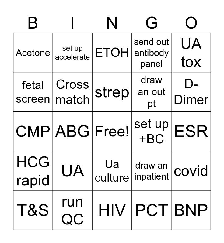 This bingo card has a free space and 29 words: T&S, BMP, ABG, CBC, Acetone, ETOH, Cross match, UA, set up +BC, run QC, ESR, BNP, HIV, PCT, D-Dimer, PT, Ua culture, HCG rapid, UA tox, CMP, draw an inpatient, PTT, draw an out pt, fetal screen, send out antibody panel, set up accelerate, covid, strep and wound culture.