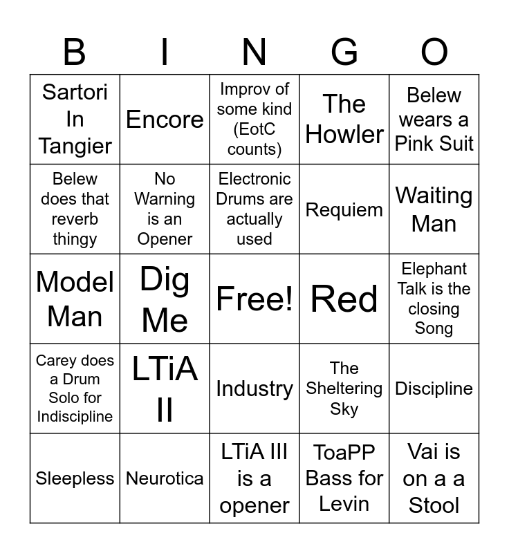 This bingo card has a free space and 24 words: LTiA II, Neurotica, Electronic Drums are actually used, Sleepless, Belew wears a Pink Suit, Sartori In Tangier, Belew does that reverb thingy, Encore, Red, Industry, Requiem, Model Man, The Sheltering Sky, Discipline, No Warning is an Opener, ToaPP Bass for Levin, Elephant Talk is the closing Song, Improv of some kind (EotC counts), Waiting Man, Dig Me, Vai is on a a Stool, Carey does a Drum Solo for Indiscipline, The Howler and LTiA III is a opener.