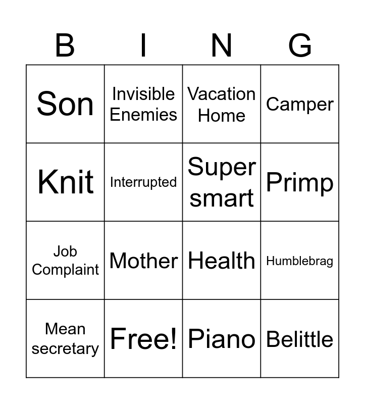 This bingo card has 16 words: Free!, Humblebrag, Vacation Home, Son, Job Complaint, Invisible Enemies, Health, Piano, Knit, Interrupted, Mean secretary, Camper, Mother, Primp, Super smart and Belittle.