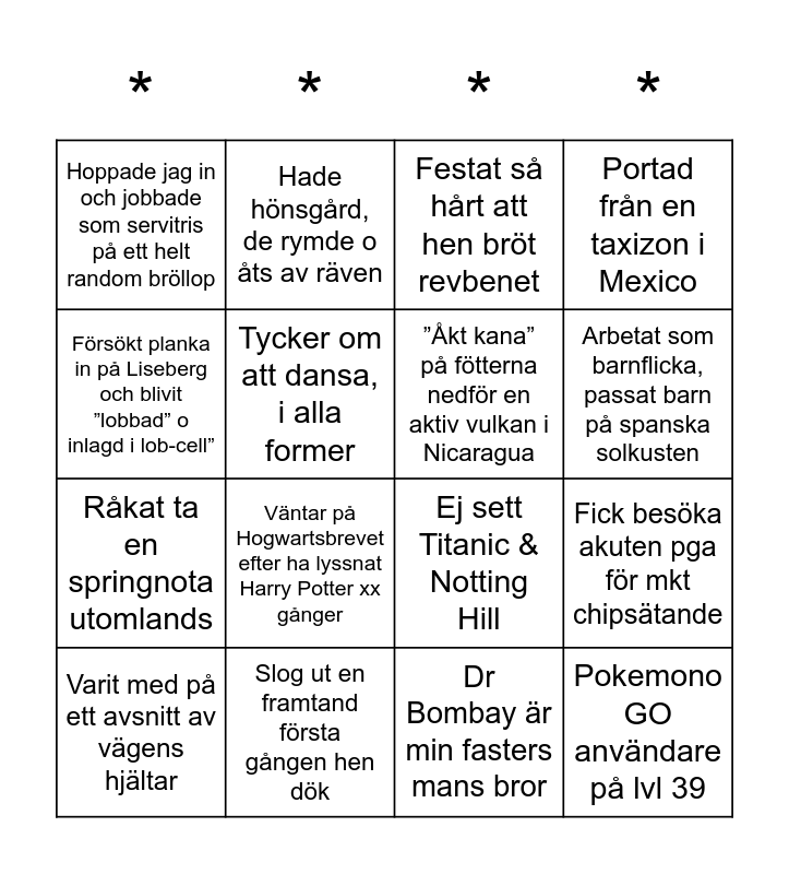 This bingo card has 19 words: Ej sett Titanic & Notting Hill, Vart Siljaguide, Festat så hårt att hen bröt revbenet, Pokemono GO användare på lvl 39, Fick besöka akuten pga för mkt chipsätande, Försökt planka in på Liseberg och blivit ”lobbad” o inlagd i lob-cell”, Dr Bombay är min fasters mans bror, Hoppade jag in och jobbade som servitris på ett helt random bröllop, Hade hönsgård, de rymde o åts av räven, Råkat ta en springnota utomlands, Väntar på Hogwartsbrevet efter ha lyssnat Harry Potter xx gånger, Tycker om att dansa, i alla former, ”Åkt kana” på fötterna nedför en aktiv vulkan i Nicaragua, Slog ut en framtand första gången hen dök, Varit med på ett avsnitt av vägens hjältar, Skrivit en uppsats/större sammanfattning av Bibeln, Portad från en taxizon i Mexico, Arbetat som barnflicka, passat barn på spanska solkusten and Käkat hund vid tillfälle.