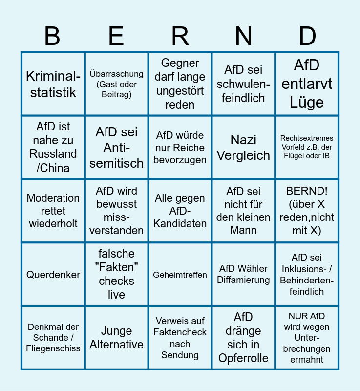 This bingo card has 1 images and 46 words: Alle gegen AfD-Kandidaten, Moderation ist nicht neutral / unparteiisch, Verweis auf Faktencheck nach Sendung, falsche "Fakten" checks live, Schrottquellen wie Correctiv, VV, ZfpS, Übarraschung (Gast oder Beitrag), Vorbereitete anti AfD Einspieler, AfD ist nahe zu Russland /China, AfD sei Anti-demokratisch, AfD sei Anti-semitisch, AfD sei schwulen-feindlich, AfD sei Inklusions- / Behinderten-feindlich, AfD Wähler Diffamierung, AfD ist schlecht für Wirtschaft, AfD schreckt Fackräfte ab, AfD würde nur Reiche bevorzugen, AfD sei nicht für den kleinen Mann, AfD zerstört mit Argumenten, AfD entlarvt Lüge, AfD wird bewusst miss-verstanden, AfD dränge sich in Opferrolle, Kriminal-statistik, Nazi Vergleich, Nazi Beleidigung, Rechtsextremes Vorfeld z.B. der Flügel oder IB, Denkmal der Schande / Fliegenschiss, Deportation, Geheimtreffen, Querdenker, Klima-Leugner, Verschwö-rungs-theorie, AfD Verbot, Gesichert Rechtsextrem, Verfassungs-Schutz, Junge Alternative, BERND! (über X reden,nicht mit X), Ehemalige / nicht Mitglieder als Argument, Störung: wiederholte Unter-brechung, Störung: Abrupter Themen-wechsel, NUR AfD wird wegen Unter-brechungen ermahnt, Gegner darf lange ungestört reden, Moderation rettet wiederholt, CDU beansprucht AfD Thema für sich, Realitäts-verweigerung, Distanzieren Sie sich? and Höcke will AfD übernehmen / hat das schon.