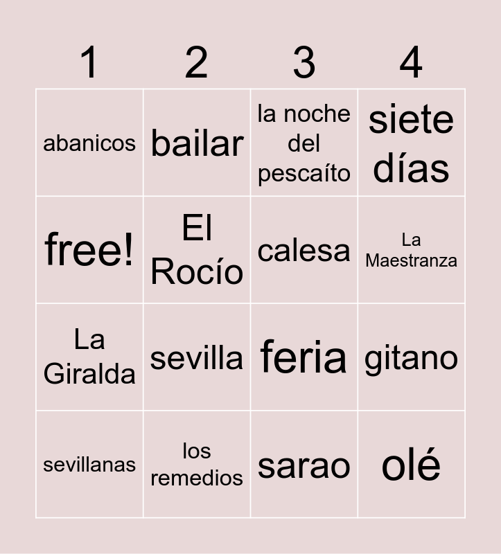 This bingo card has 45 words: flamenco, sevillanas, pescado, españa, casetas, el desfile, la noche del pescaíto, alumbrao, free!, ganado, siete días, los remedios, corridas de toros, ropa tradicional, portada, la real maestranza, abril, feria, andalucía, sevilla, bailar, casetas, castañuelas, abanicos, sevillanas, sarao, rebujito, torre del oro, plaza mayor de Sevilla, olé, faralai, bingo, tómbola, verbena, gitana, gitano, carmen Sevilla, gazpacho, salmorejo, La Maestranza, El Rocío, La Giralda, espetos, calesa and flamenco.