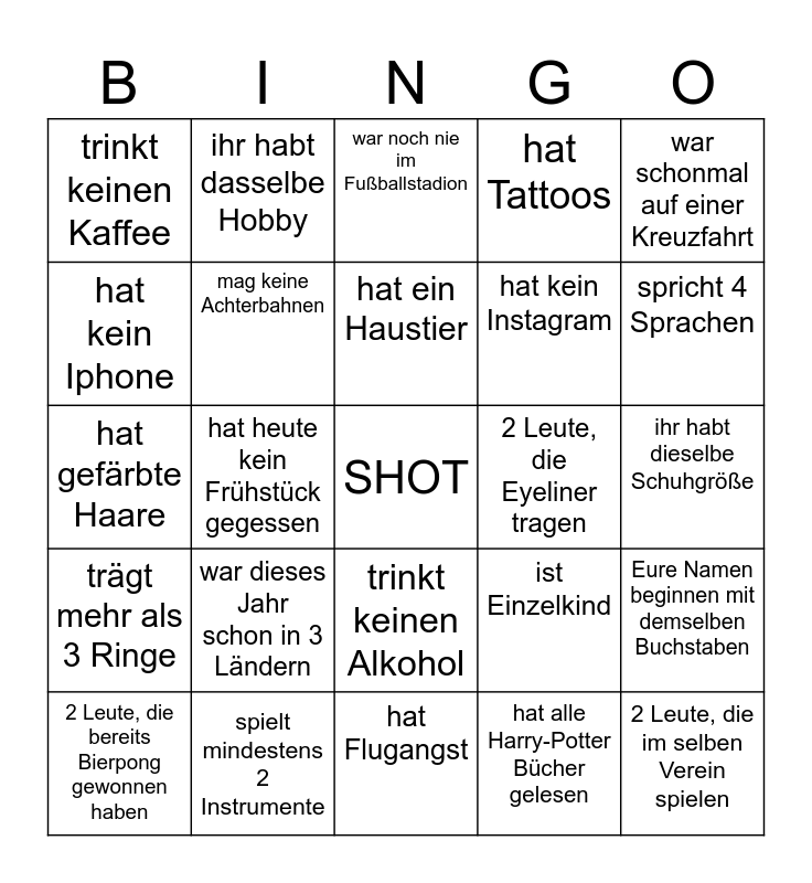 This bingo card has a free space and 32 words: hat alle Harry-Potter Bücher gelesen, kennt seinen / ihren Aszendenten, hat heute kein Frühstück gegessen, war mal im Fernsehen, trägt mehr als 3 Ringe, mag keine Achterbahnen, war schonmal auf einer Kreuzfahrt, Eure Namen beginnen mit demselben Buchstaben, ihr habt dasselbe Hobby, hat heute noch nicht geduscht, hat ein Haustier, war noch nie im Fußballstadion, hat letztes Jahr Campingurlaub gemacht, hat sich die Haare selbst geschnitten, 2 Leute, die Eyeliner tragen, hat sich schonmal was gebrochen, 2 Leute, die bereits Bierpong gewonnen haben, hat gefärbte Haare, trinkt keinen Alkohol, war dieses Jahr schon in 3 Ländern, ist Einzelkind, jüngste Person der Party, ihr habt dieselbe Schuhgröße, spielt mindestens 2 Instrumente, 2 Leute, die im selben Verein spielen, hat Tattoos, hat kein Instagram, hat kein Iphone, trinkt keinen Kaffee, hat Flugangst, 3 Leute, die nicht aus Dresden kommen and spricht 4 Sprachen.