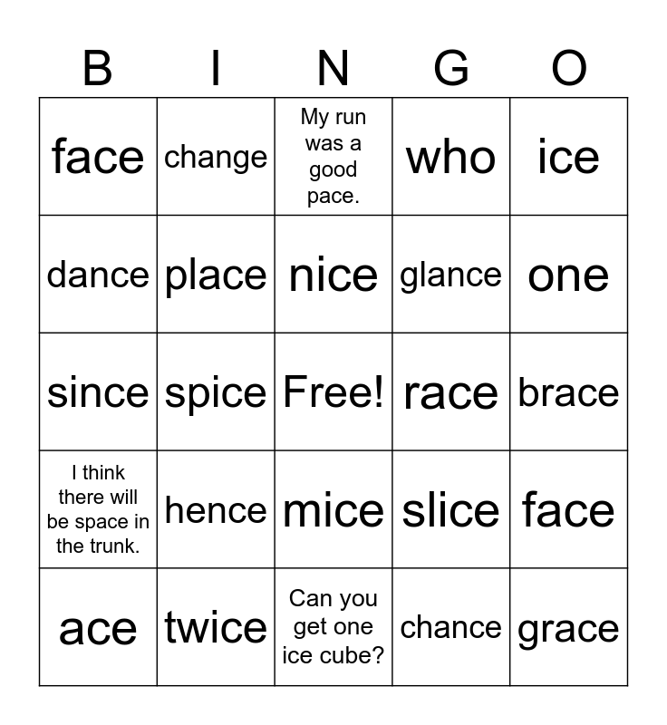 This bingo card has a free space and 24 words: ace, hence, nice, chance, ice, face, change, My run was a good pace., race, brace, since, place, slice, face, dance, twice, Can you get one ice cube?, who, one, I think there will be space in the trunk., spice, mice, glance and grace.