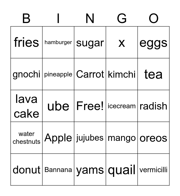 This bingo card has a free space and 24 words: Apple, Bannana, Carrot, donut, eggs, fries, gnochi, hamburger, icecream, jujubes, kimchi, lava cake, mango, oreos, pineapple, quail, radish, sugar, tea, ube, vermicilli, water chestnuts, x and yams.